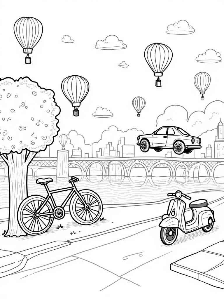 This lively cityscape is bursting with color and creativity. Above, you’ll see hot air balloons of all shapes and sizes floating gently in the sky, adding a cheerful touch. Below, a giant bicycle with oversized wheels leans against a friendly tree, its spokes creating a fun pattern that kids will love to color in. You can also spot a sleek, futuristic car hovering just above the ground, reflecting the sunlight in a cool way. Vintage scooters are parked along the curbs, showing off their unique designs that contrast nicely with the modern vehicle.