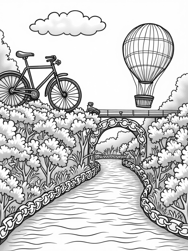 In the background, an imaginative bridge made of intertwined bicycle chains arches over a flowing river filled with paint. The bright hues reflecting in the water create a dreamy atmosphere, inviting kids to grab their crayons and unleash their creativity. Who wouldn’t want to color in this magical cityscape?