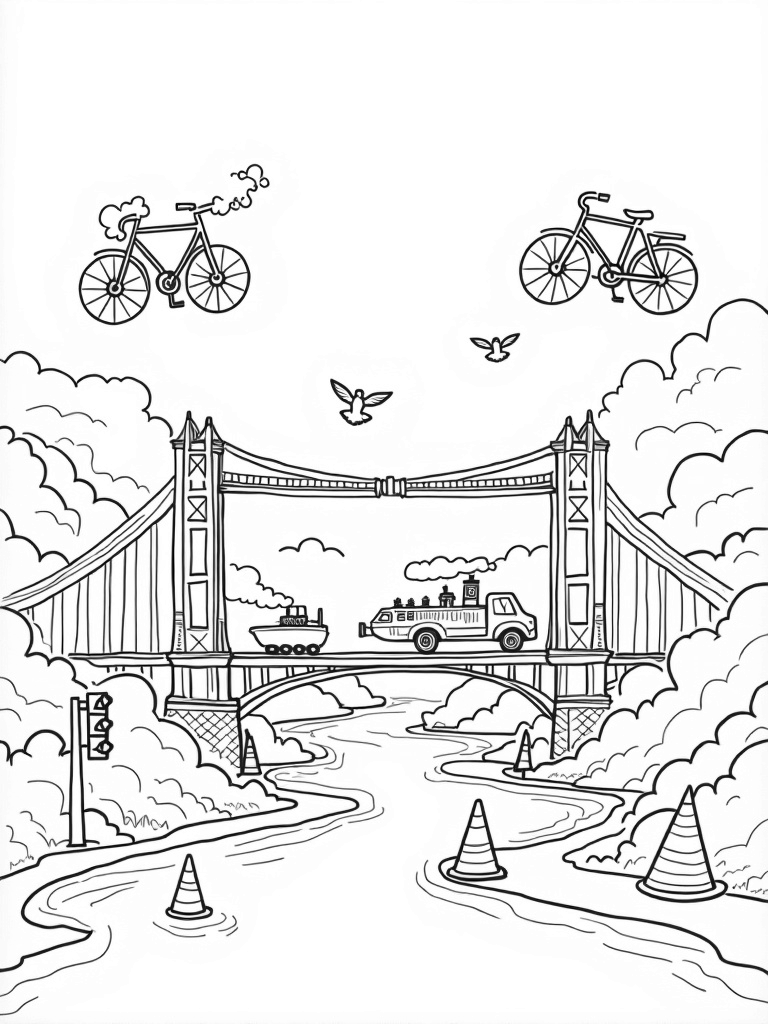 As you color in this scene, don’t miss the oversized traffic cones and lights scattered along the riverbanks. Each one has playful patterns and colors, making it an invitation for your creativity to shine. Grab your favorite crayons or markers and let your imagination run wild!