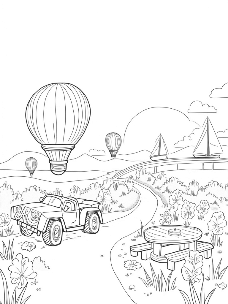 In this delightful scene, colorful hot air balloons float lazily above a winding road. Below, a charming vintage car with oversized wheels makes its way through a field bursting with blooming flowers. And if you look closely, there's a sleek motorcycle parked beside a giant gear that's cleverly turned into a picnic table!